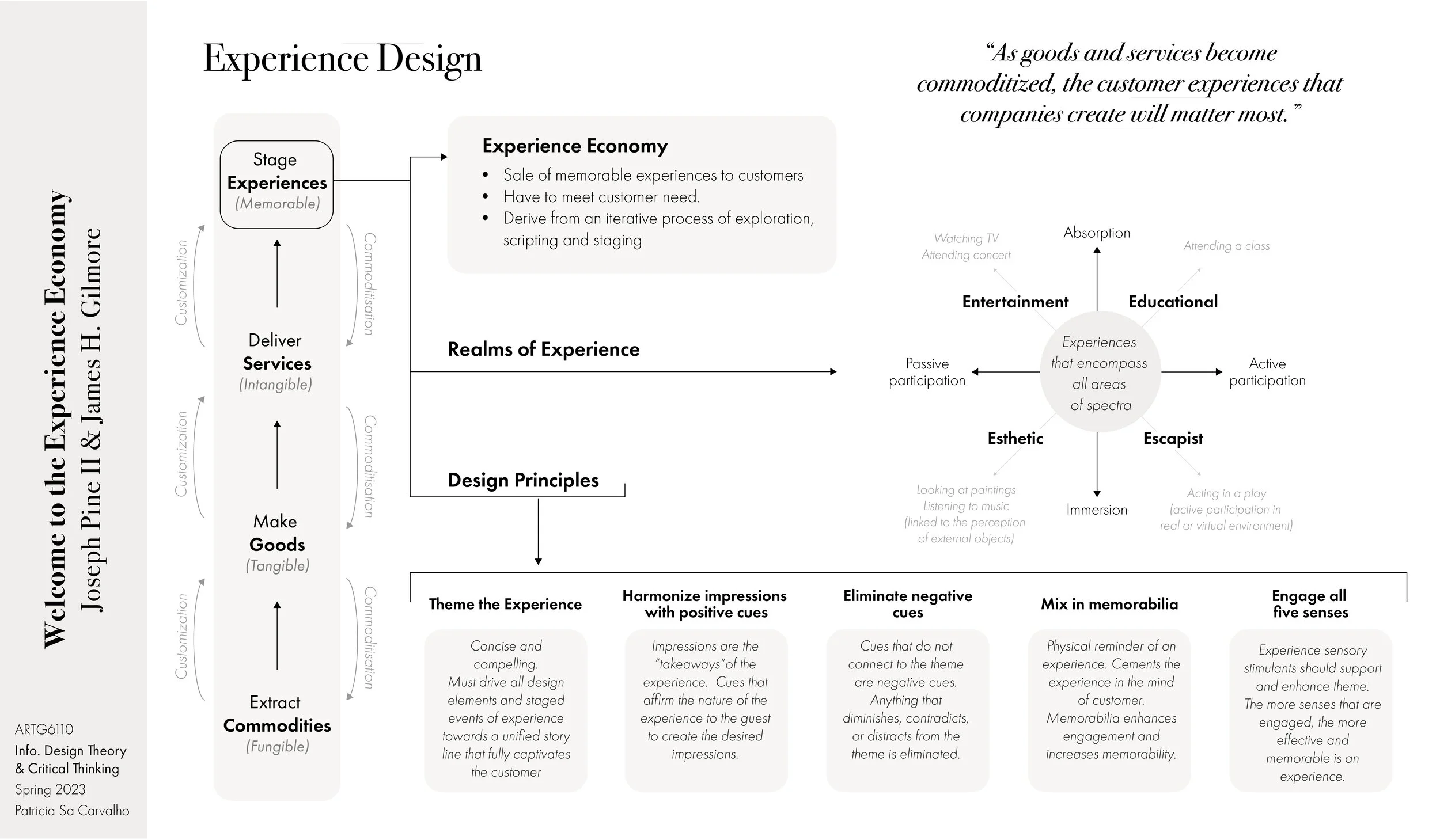 This map stands out for its use of quadrant logic—placing types of experiences within a 2x2 matrix based on participation and connection level. Supplementary modules elaborate on design principles and sensory strategies. The clarity of axis-based design and use of repetition in labeling (“Customization / Commoditization”) makes this a strong example of conceptual framing.